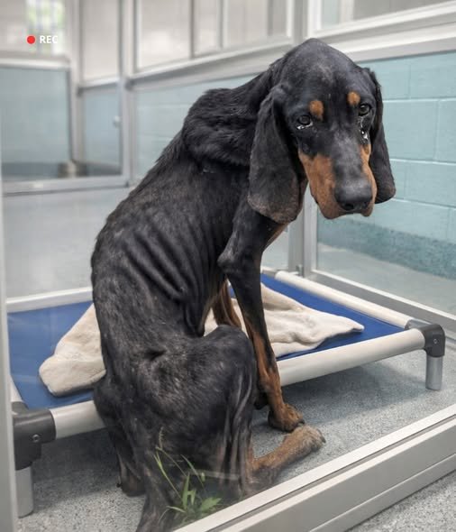 By every physical measure, he should have lain down. His body — a Black and Tan Coonhound that should have carried sixty-five healthy pounds on a long, elegant frame — had been reduced to something skeletal. Every rib was individually countable. His spine ran the length of his back like a series of sharp ridges. His hip bones jutted at angles that suggested the skin was simply draped over a structure with nothing left beneath it.