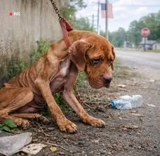 A rope leash trailed beside him, tied loosely to a metal post. That detail told a painful story — this wasn’t a stray who wandered too far from home. This was a dog who had belonged to someone.