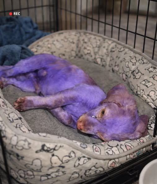 When rescuers found Benny, the tiny puppy was dyed bright purple, his ears sore and one eye painfully irritated. But he didn’t cry or run… he simply stood there quietly—until gentle arms lifted him, and he leaned in as if he’d been waiting for kindness. Full Story In Comment 👇🐾🐶