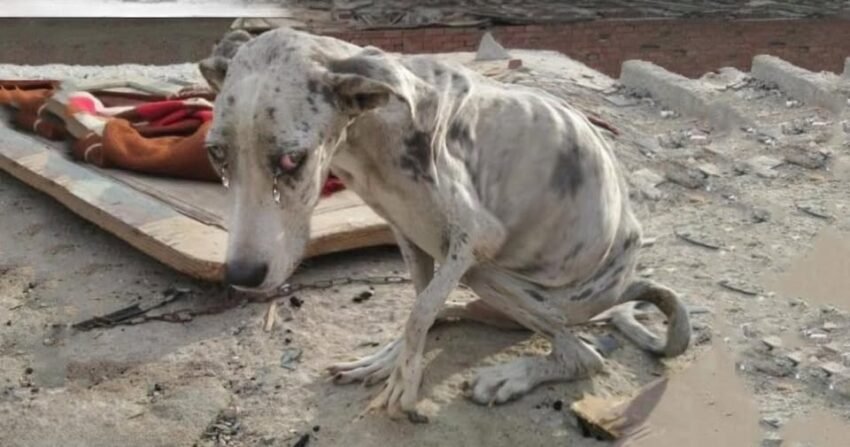 He was sitting on the cold ground, barely able to hold himself upright. His body was painfully thin — ribs pressing against fragile skin, hips sharply defined, legs trembling under his own weight.