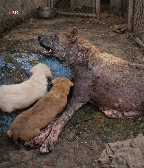 Unable to stand, the mother dog stayed close, hoping to keep her puppies safe.
