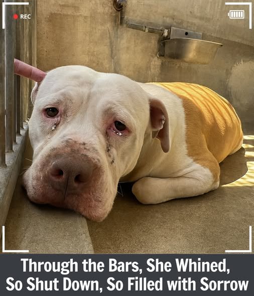 If you’ve ever walked through the kennel row of an animal shelter, you know the sounds. Barking, mostly—dogs demanding attention, begging for release, announcing their presence to anyone who will listen. It’s loud, chaotic, and hopeful in its own way. But if you listen carefully, past the noise, you might hear something else. A soft, almost inaudible whine. It doesn’t demand. It doesn’t beg. It simply… exists. A sound of pure, unadulterated sorrow. And if you follow that sound to its source, you might find a dog like her. Pressed against the back wall of her kennel, tucked into the smallest possible shape, her eyes fixed on nothing. She doesn’t bark because she doesn’t believe anyone will answer. She doesn’t hope because hope has failed her too many times. She is shut down. She is filled with sorrow. And she is waiting, not for a home, but for the end.